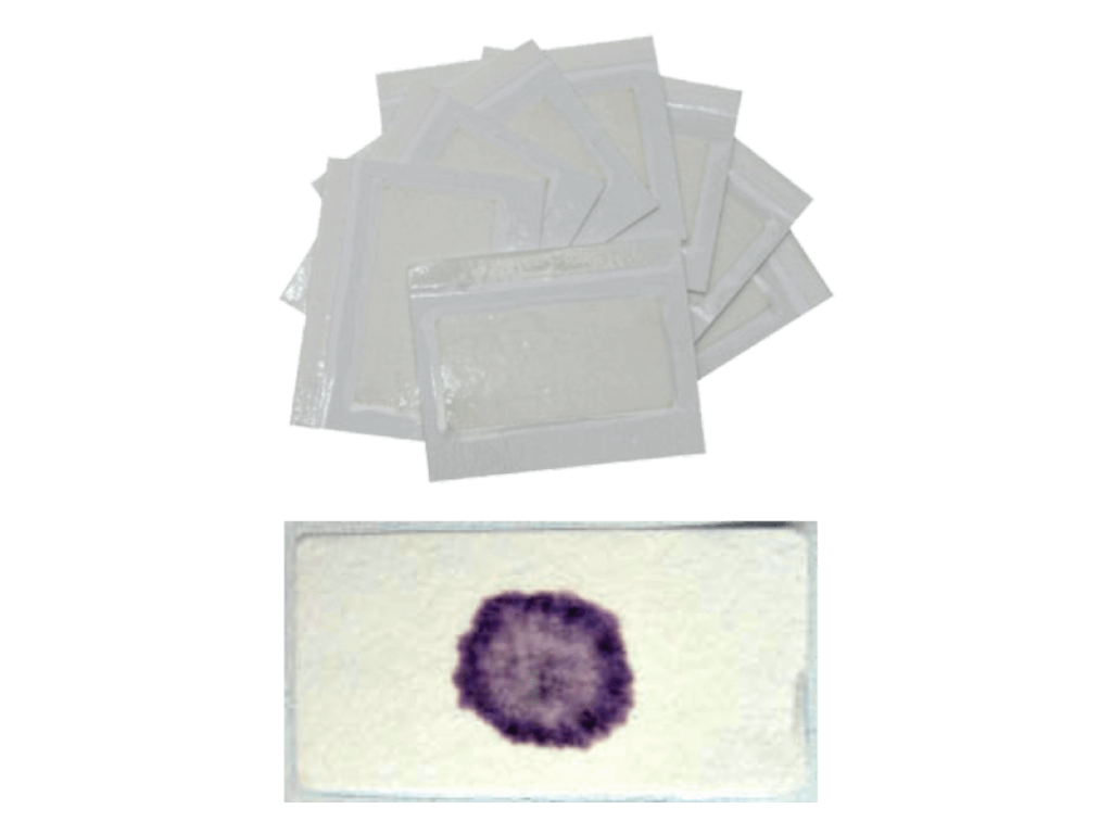 A 2-5 drop aliquot of deionized water was placed on a suspect area of a garment, and an AP test strip was pressed against it. A color change to bright purple within 15 s was a POSITIVE test. Alternatively, a cotton-tipped swab was placed against the wetted area of the garment, and then the garment was pressed gently around the swab in order to saturate the swab with solution. This was done in several places on the garment. Then, the swab was pressed against an AP test strip. This procedure yielded an easily visualized, high-contrast spot. It also avoided leaving any stain on the garment.