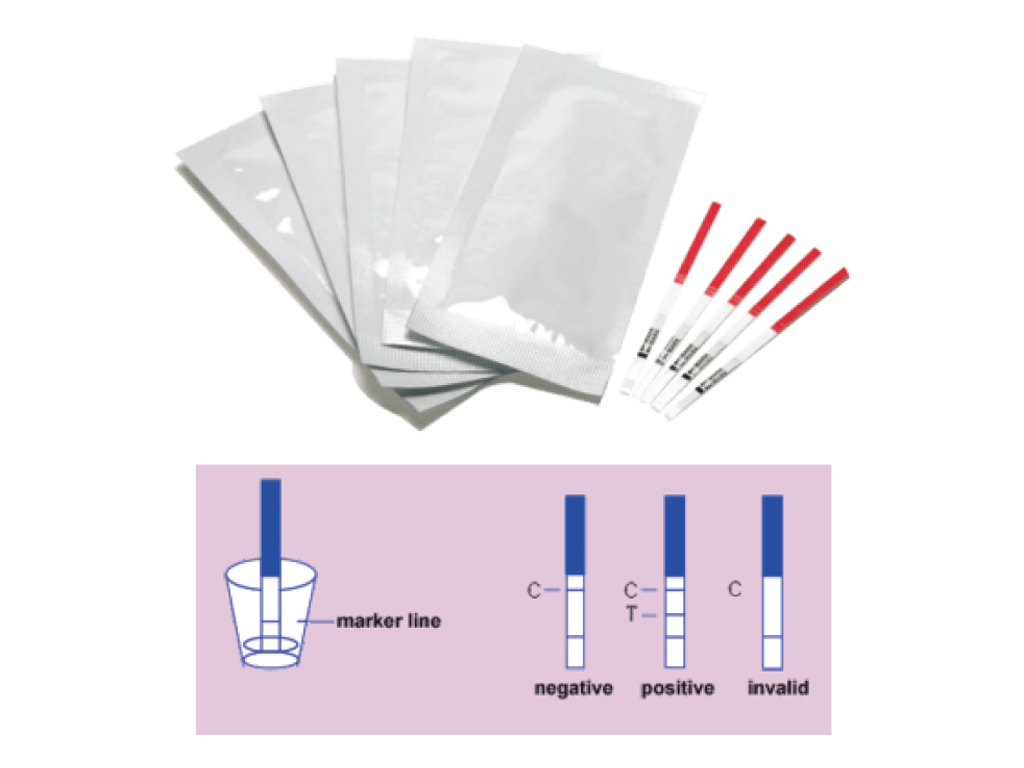 A 15-mL aliquot of water was placed in a coffee cup. The suspect area (i.e. crotch) of a pair of cotton underwear was extracted in the cup by repeatedly allowing water to soak in, then pressing it out. Finally, the garment was wrung out into the cup. A PSA test strip then was placed into the cup. It was necessary to tilt the cup on edge to immerse the strip. Care was taken not to immerse the strip above the marker line. After 10 minutes, the strip was removed and laid on a clean, dry surface. The strip was read after an additional 10 minutes. Resolution continued to improve for 30 minutes after the strip was removed from the coffee cup, but tended to decrease after that. A POSITIVE test was indicated by two lines as shown in Fig. 10. A strongly positive test was clearly visible within two minutes, while a weakly positive test took 20 minutes (after immersion) to become evident.