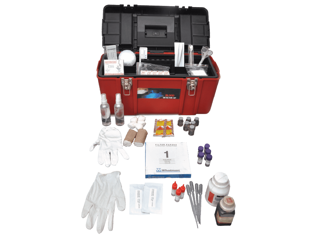 This kit contains all the essential equipment for blood testing in any field investigation situation. It has the advantage that it contains all conventional and modern methods material. All the necessary support equipment is included. The kit and accessory equipment are also suitable for laboratory use. Through the use of this kit, the field investigator can prove the presence or absence of blood. And also determine whether the blood detected is of human or not.