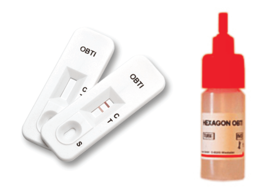 Screen for presence of human blood within 2 to 3 minutes. A two-part test consisting of a liquid-filled collection tube and a test strip denies or confirms the presence of human blood by a display of one or two blue lines.