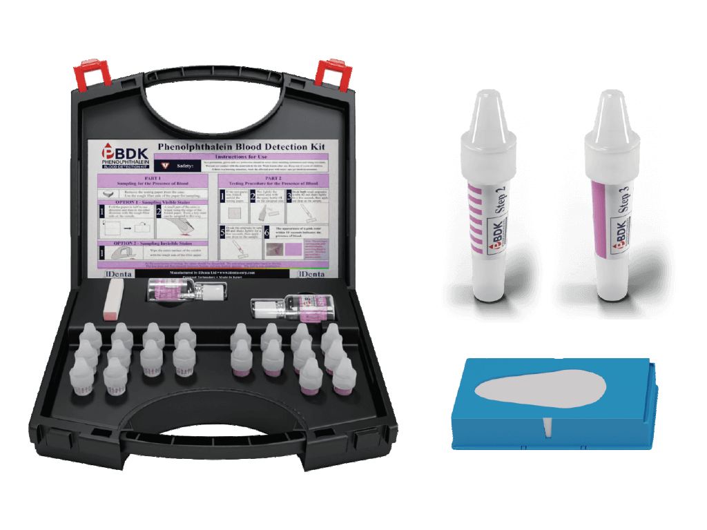 Tetramethylbenzidine (TMB) Blood Test Kit is a highly sensitive presumptive test used to determine whether a suspected stain is blood or not.