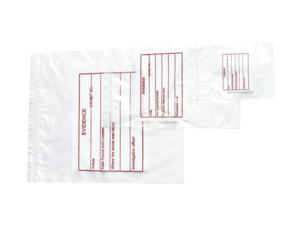 | 01 | Set of Pre Printed Write Block Zip-Top Evidence Bags 4"x 6", 6"x10" & 9"x12" (20 each) |