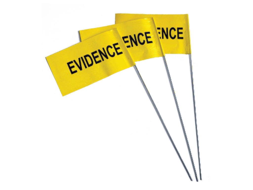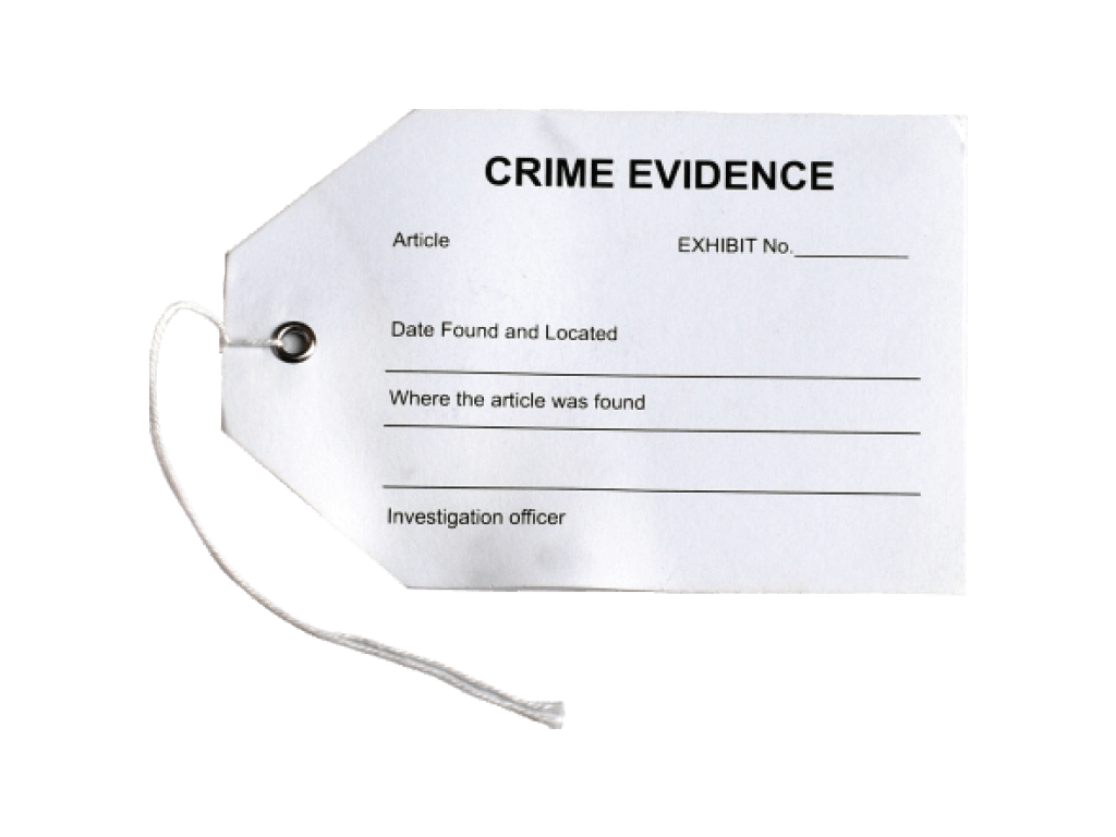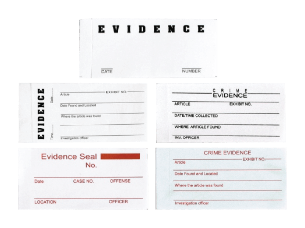 Evidence Tags are printed in red on heavy paper stock and have eyelets and cotton thread to tie with evidence