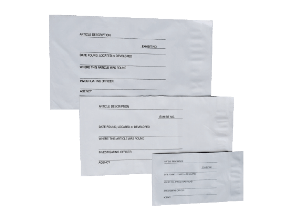 Preprinted with the pertinent information when collecting evidence and strong pre-gummed seal to ensure integrity