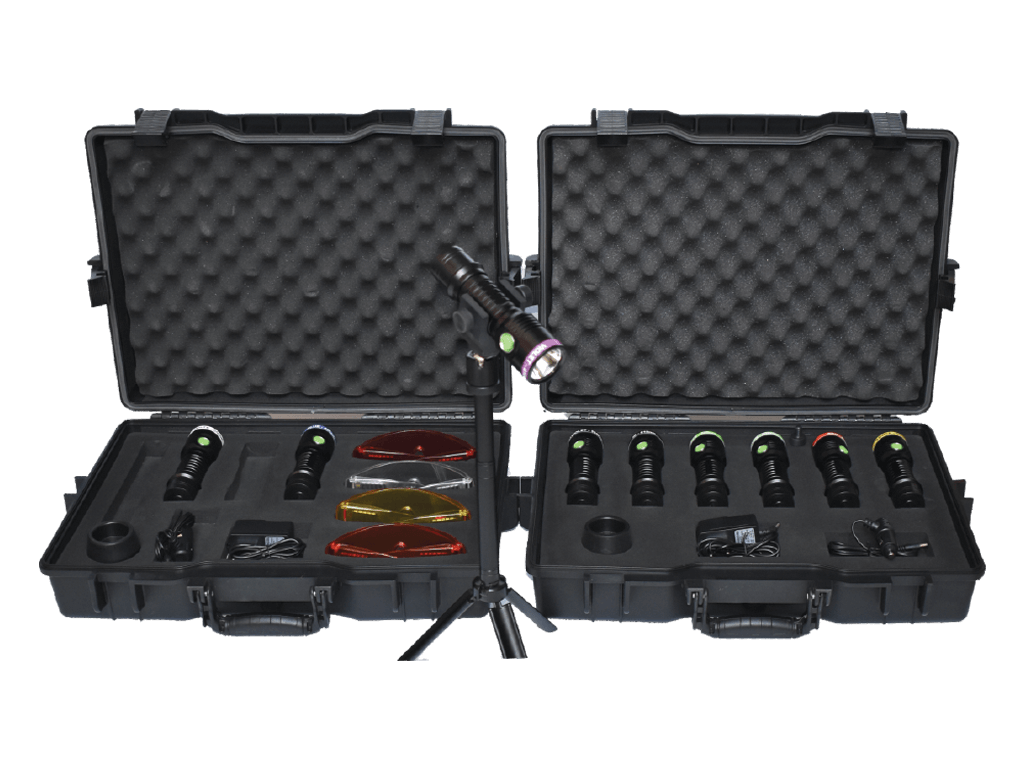 A LED light source for illuminating shoe prints, fibers, blood spatter & particulate evidence. It is LED based light source that provides an alternative beam profile for locating evidence at the crime scene. Cylindrical lens to give a wide “linear” light beam that is ideal for detecting surface debris and shoe prints in dust. Accessories include red, amber & clear UV absorbing goggles to enhance contrast. A telescopic pole / tripod which adds convenience for prolonged floor and static searches.