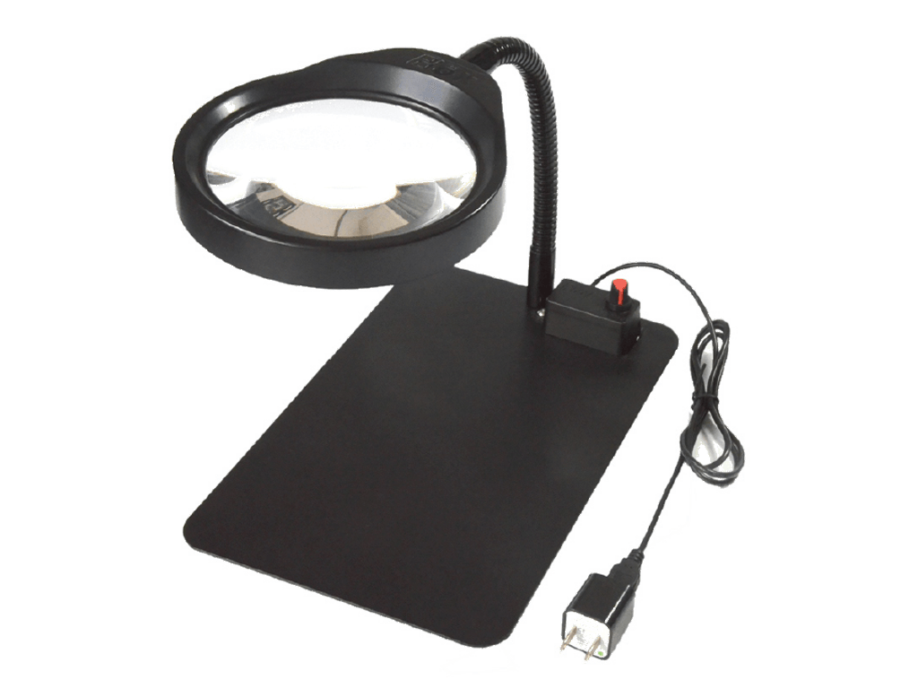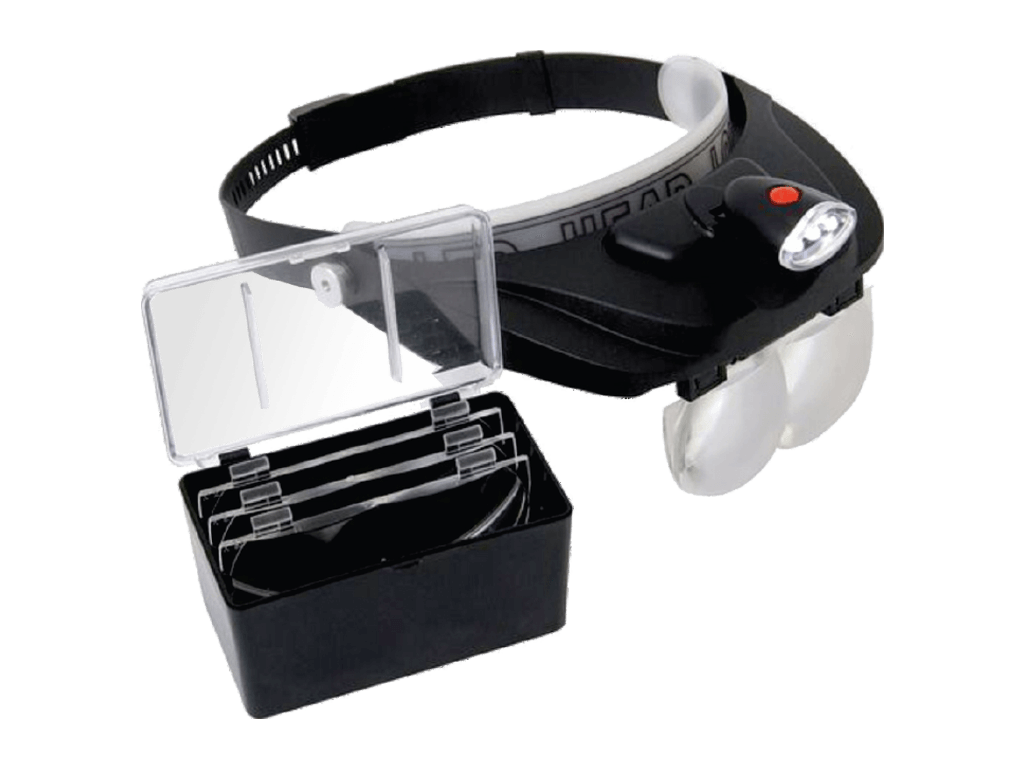 It comes with four changeable lenses (1.2X, 1.8X, 2.5X, 3.5X) supplied with their own storage case. The lenses stay firmly in position when raised or lowered, leaving both hands free to work.