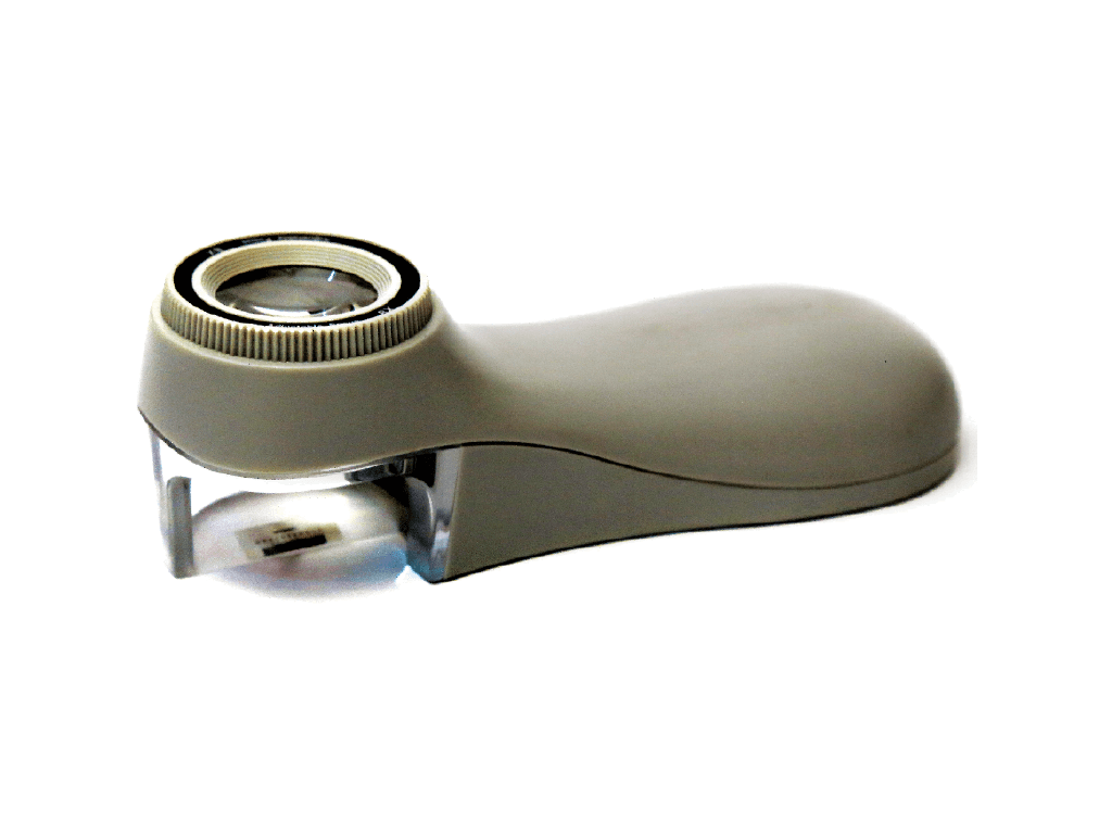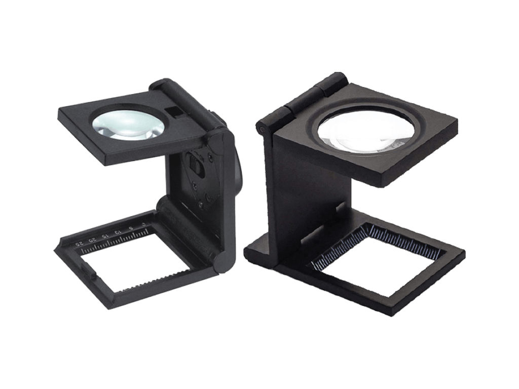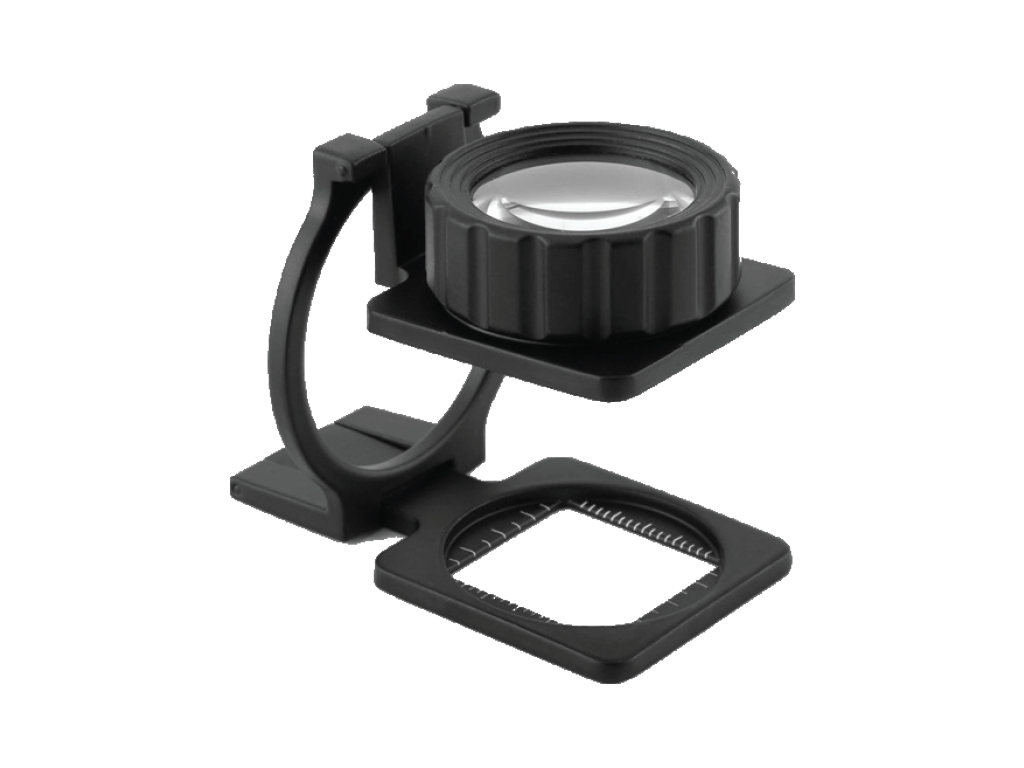 This high-quality, 5X, 8X, 10X, 12X and 15X fixed-focus magnifier folds up into a compact plastic or stainless steel unit for storage in a vinyl case. The lenses are of fine quality, optically ground and polished glass. The base is clearly marked with graduation lines on 4 sides.